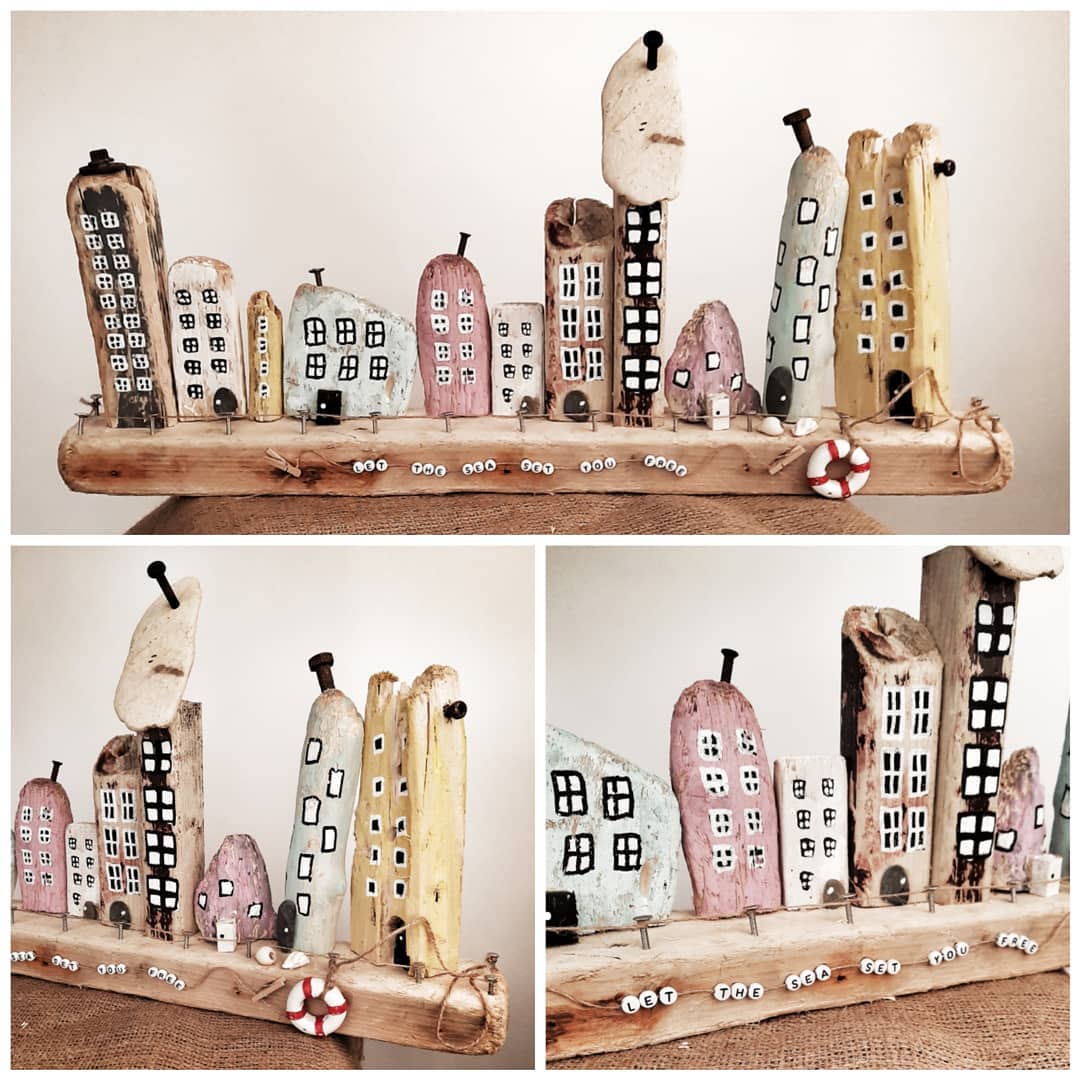 My Quirky Driftwood Villages are full of colour and fun. They are not meant to be exact replicas of particular places, however I do create some landmark areas. Most popular is Hook Lighthouse. I also create Youghal Lighthouse, The Metal Man Tramore and Dunmore East. All these Images are samples only as already sold. More recent images will appear on my Facebook business page. These sell out very fast. Hope you like them. They are great fun to make, a very slow process like most of my Driftwood Art, but as always seeing the end result makes it worth it. Prices vary, the majority are €55, and larger ones go for €65, €75 and €85.